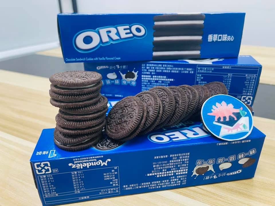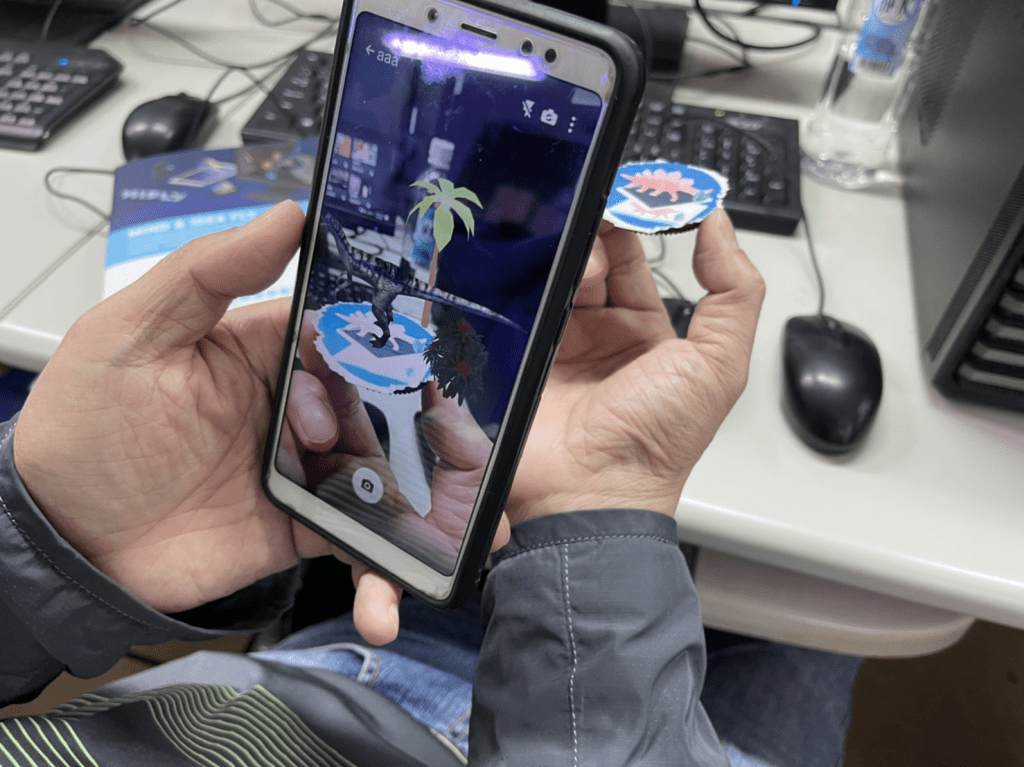 用糯米紙印刷出來的貼紙,黏在好吃的餅乾上面,再添加AR的功能,把恐龍給呼叫出來!點了恐龍還會有叫聲!