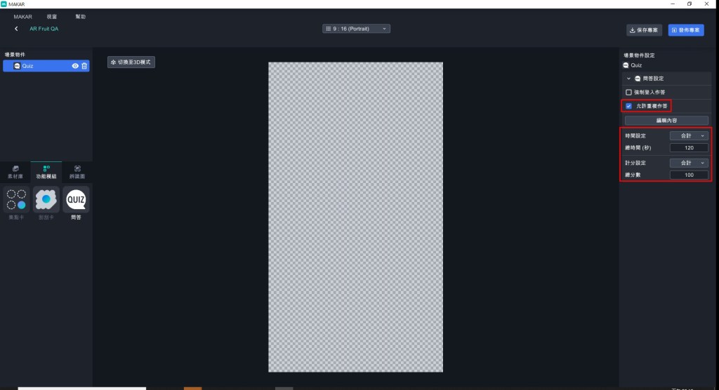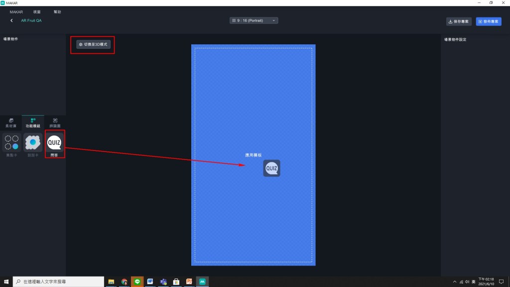 9.切換功能模組 > 按住 問答模組 拖拉至畫面中