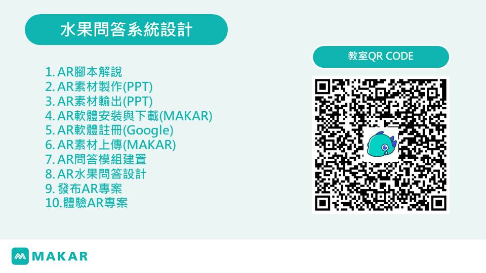 本次課程以AR問答系統為規劃,根據課程大綱製作本課程所需之AR素材並進行輸出,輸出完成後進入製作AR問答模組功能,完成並發布至手機體驗後,可登入官方網站數據後台,進行觀看學習歷程記錄。