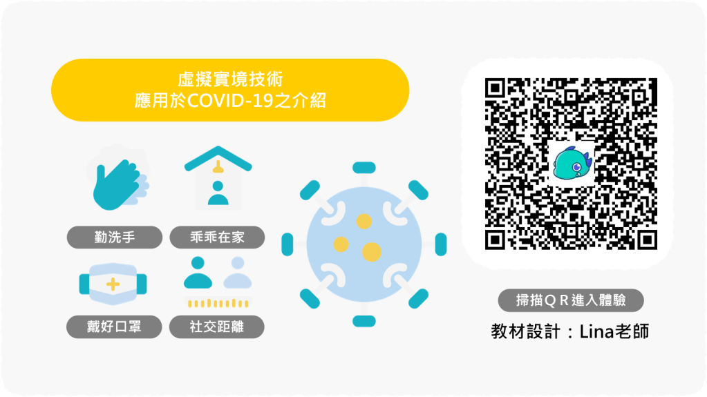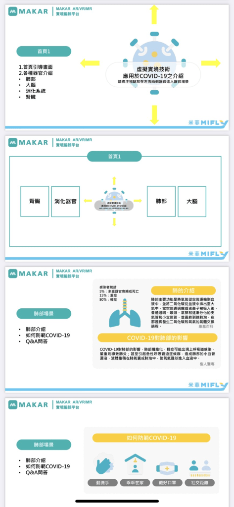 課程內容以PPT帶入VR腳本創作,透過PPT內建形狀工具排版設計,完成整體課程素材的設計,其中包含:按鈕、說明圖、問答題設計及學習卡設計,下圖為本次課程透過PPT製做之COVID-19腳本及素材,透過簡易的編輯方式,可隨時更新腳本內容及文字,省去學習專業設計軟體的時間,原來用PPT也可以製作多元化素材。