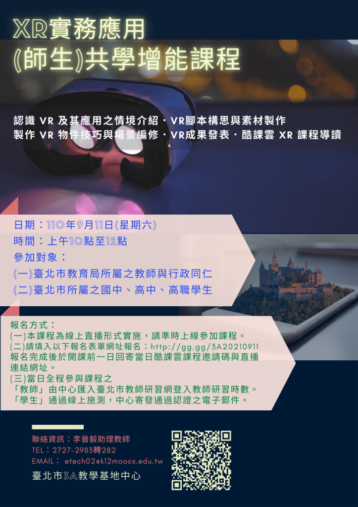 因應推動師生共學增能,本次課程由臺北市教育局指導,臺北市3A教學基地中心執行。課程內容與對象為:臺北市教育局所屬之教師與行政同仁、臺北市所屬之國中、高中、高職學生,提升師生在XR數位教材內容的數位能力增能培養。
